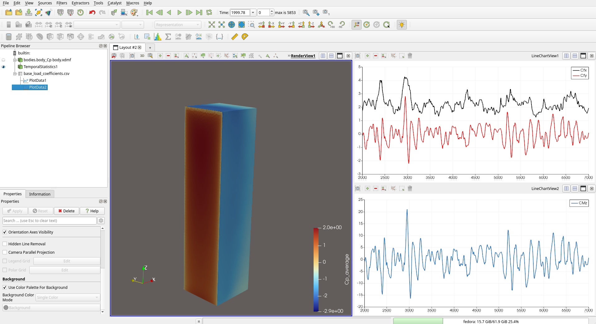Load coefficient time series (\(C_{fx}\), \(C_{fy}\), \(C_{Mz}\)) plotted in ParaView alongside the building surface coloured by \(c_p\).¶
