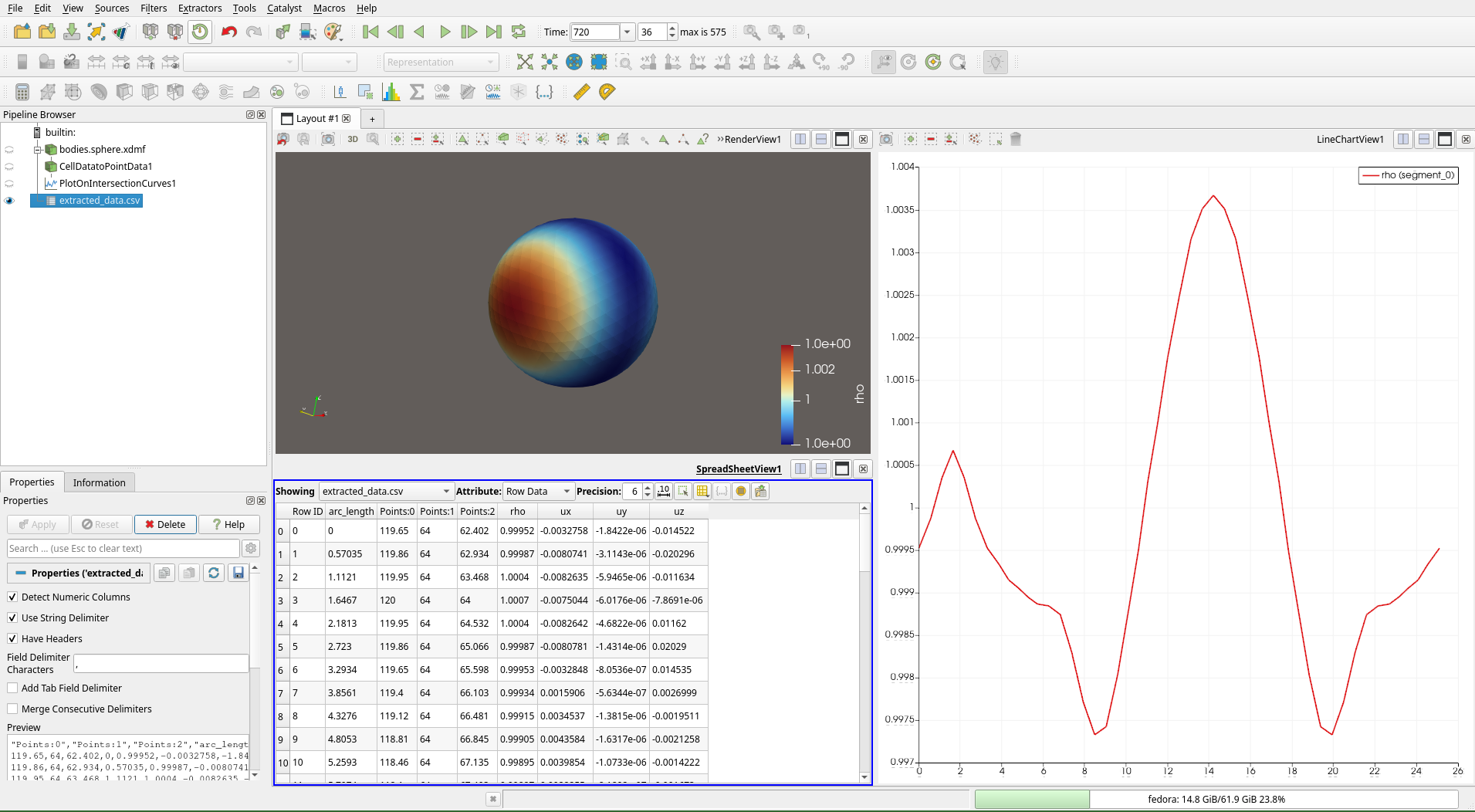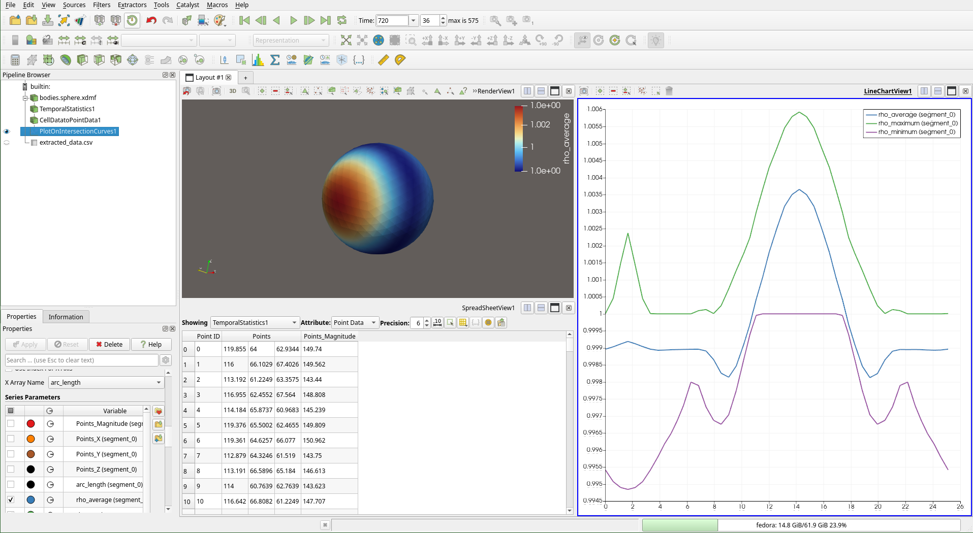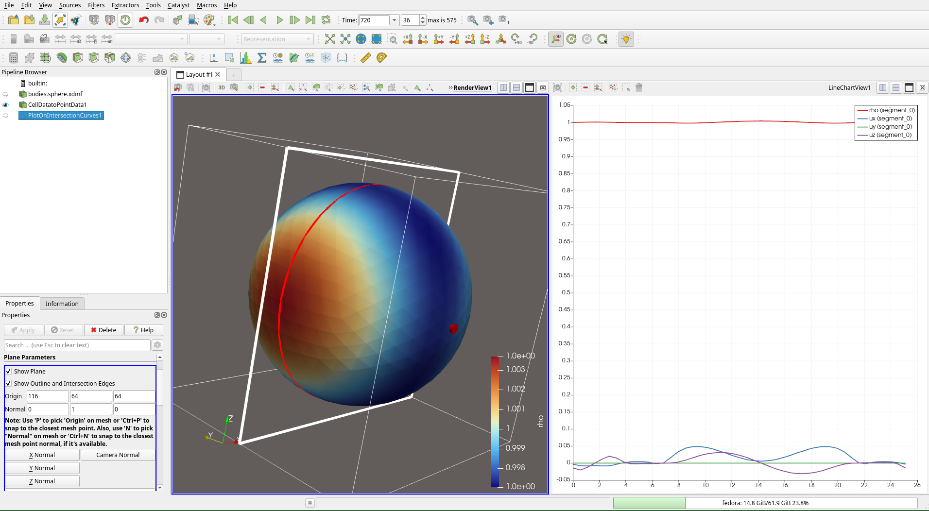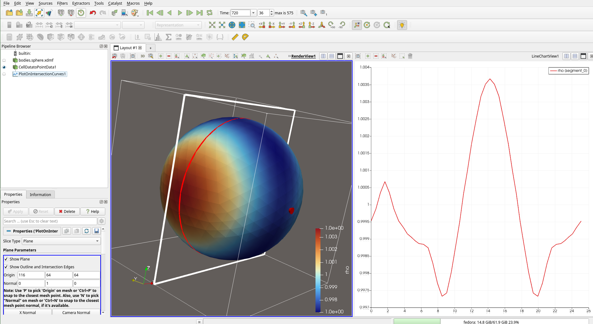 ParaView will display a line chart of the selected field versus arc length along the intersection curve. The 3-D view shows the intersection polyline on the surface, so you can visually confirm the cut location.